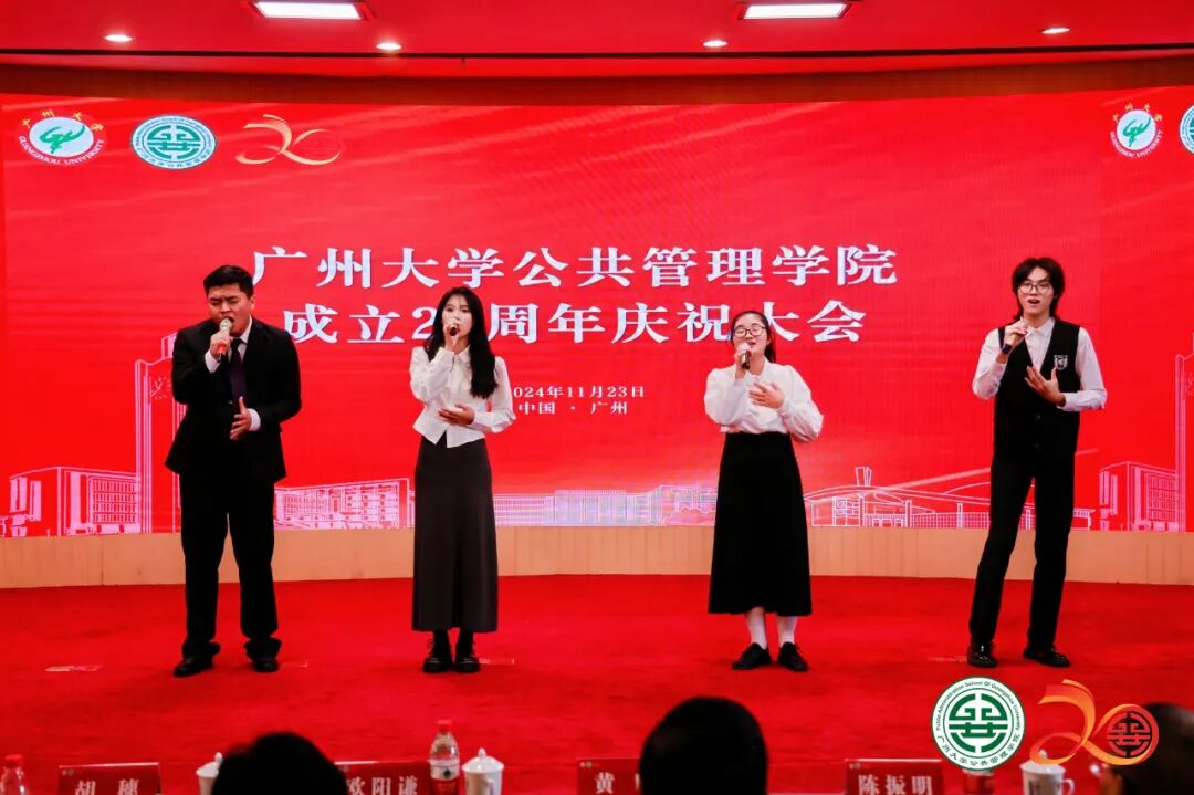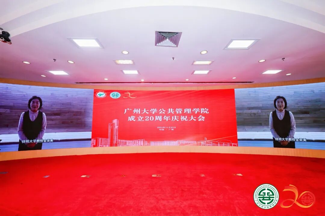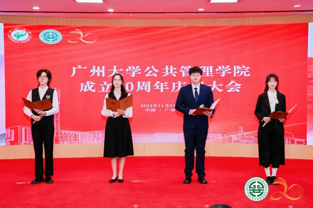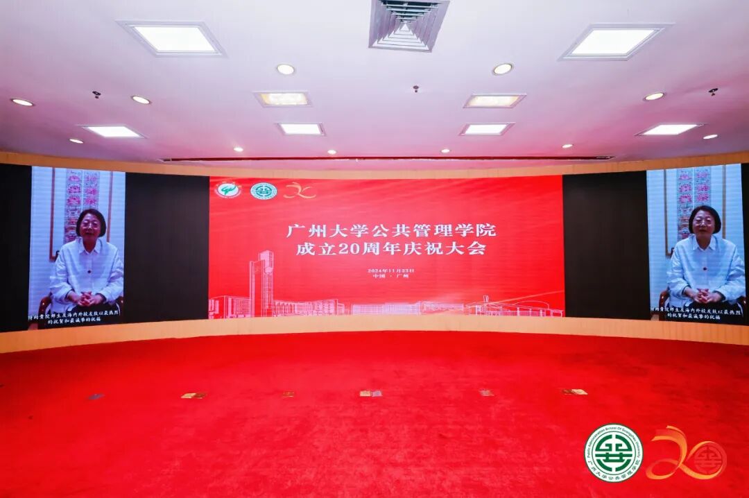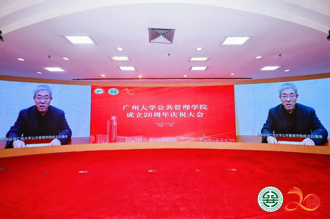 2024年11月23日上午,广州大学公共管理学院成立20周年庆祝大会在广州大学图书馆国际学术报告厅隆重举行。广州大学党委书记欧阳谦出席会议并致辞,广州大学纪委书记陈晓晖出席会议。政界嘉宾代表中联部原副部长于洪君、广东省人民政府参事、广东省乡村发展协会理事长钟韶彬、广东省社会科学界联合会顾问王永平,学界嘉宾代表厦门大学社会科学部主任陈振明,中山大学社会科学部主任肖滨,国家哲学社会科学领军人才、兰州大学管理学院院长何文盛,高校领导代表湖南工程学院党委书记黄昕、湖南第一师范学院校长胡穗、星海音乐学院原党委副书记陈平等应邀出席会议。复旦大学、中山大学、兰州大学、新疆大学、内蒙古大学、贵州大学、广西师范大学、华南理工大学、华南师范大学、暨南大学、深圳大学、华南农业大学、广东外语外贸大学、广东财经大学、广东省委党校等兄弟学院负责人,合作企业代表、全球校友代表、部分学校职能部门负责人以及学院师生代表500余人出席大会。大会收到全球154个兄弟院校、学术机构和合作伙伴发来的贺信。大会由广州大学公共管理学院党委书记刘向晖主持。