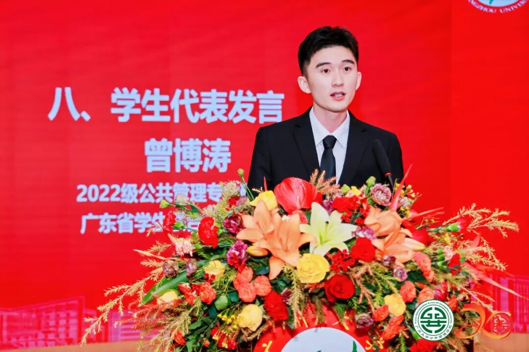 教育部新世纪优秀人才、国家社科基金重大项目首席专家谢治菊教授、广州市越秀区穗青社会工作服务中心理事长李学斌,广东省学生联合会执行主席曾博涛分别作为教师代表、校友代表和学生代表发言。广州市越秀区穗青社会工作服务中心理事长李学斌校友讲述了在社会工作专业学习中收获知识、友情和爱情的动人故事,他感谢学院悉心培养与教导,倡议广大校友发挥专业所长致力建功新时代。广州大学乡村振兴研究院院长谢治菊教授在发言中深情讲述了带领团队深入田野沃土,跨越15省、亲历15万公里、记录3000余名基层干部施政足迹的科研育人之旅,展现了对减贫治理、结对帮扶和乡村振兴等领域研究的深刻洞察和不懈追求,呼吁师生以谦虚之姿、务实之举、勇毅之心、包容之质,共同开创璀璨明天。广东省学生联合会执行主席曾博涛同学在发言中强调学院“培育公共精神 创造健康社会”理念之于学子胸怀、情怀和责任感培养的重要意义,他祝愿学院桃李芬芳、再续辉煌。