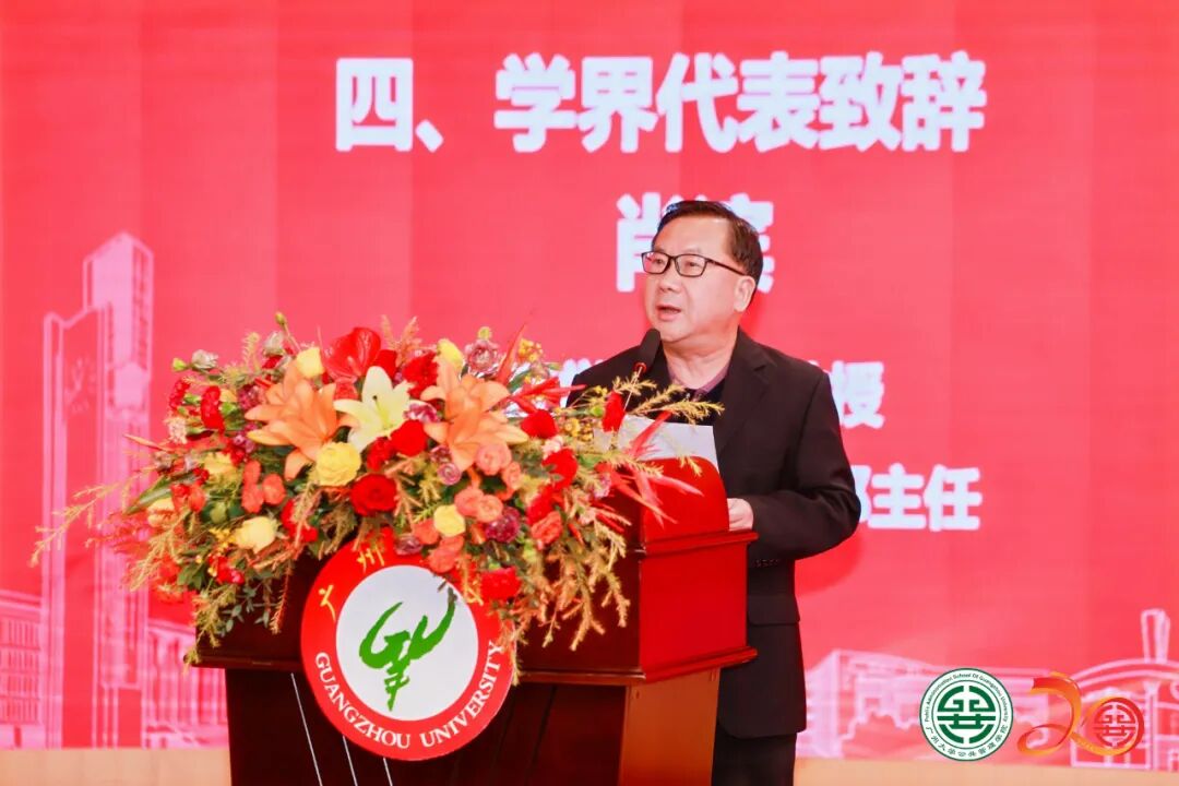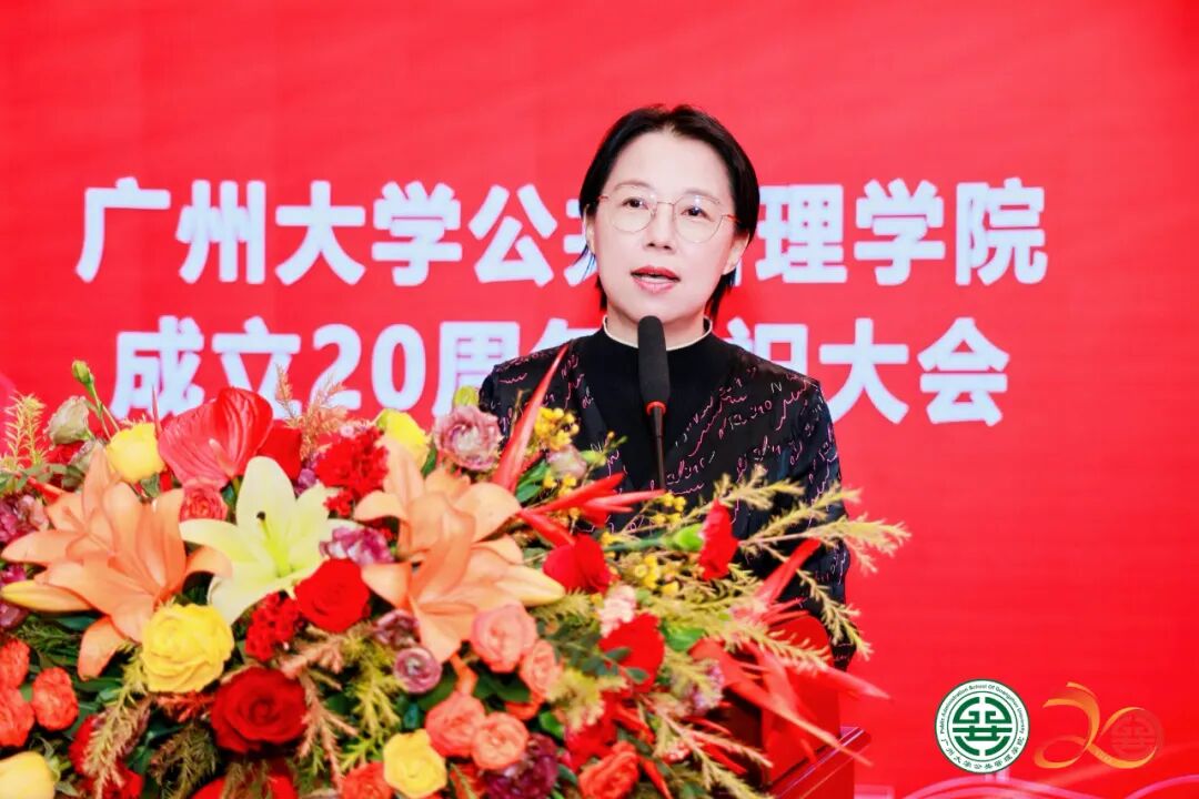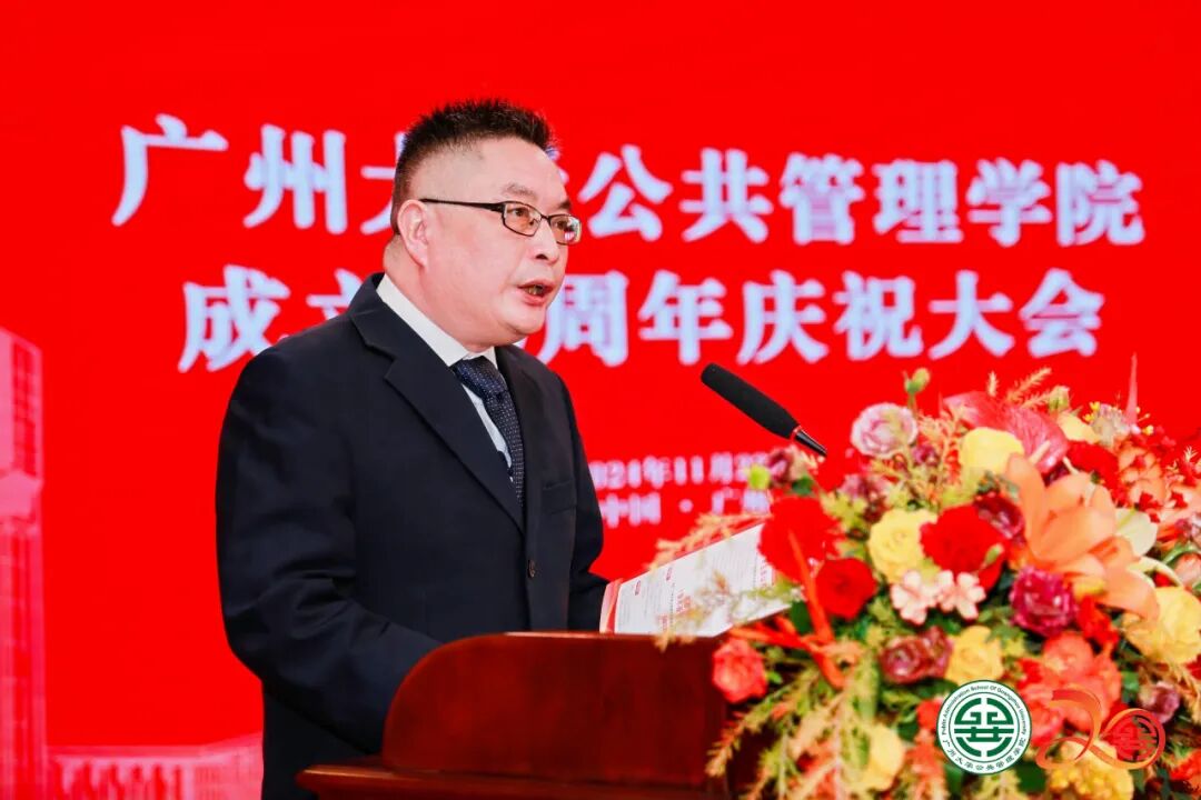 国家哲学社会科学领军人才、广州大学公共管理学院院长陈潭教授在大会上作了题为《继往开来启新程,砥砺前行谱新篇》的二十年发展报告。他从党建引领、师资队伍、人才培养、科学研究、社会服务、开放办学、院系治理等方面回顾了建院二十年来所取得的成就和经验。他强调,二十年来的发展离不开学校党委的英明领导和社会各界的大力支持,离不开师生们和校友们的共同努力。他勉励师生继续保持“低头跑路”的处事习惯、养成“抬头看路”的行事姿势,保持“自闭桃园称太古”的为学姿态、胸怀“欲栽大木柱长天”的育人大志,保持“功成必定有我”的强大自信、胸怀“功成不必在我”的宽广境界。