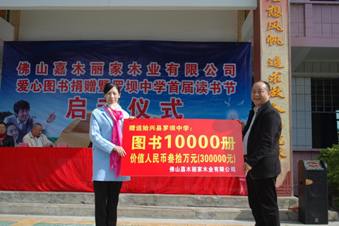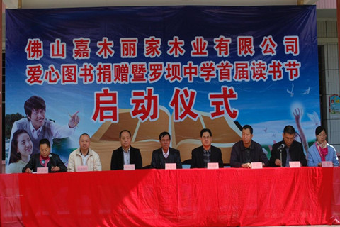 本网讯(通讯员 潘冬萍报道) 继10月17日广东文化扶贫工程启动后,文化扶贫再向纵深推进。12月5日,由佛山嘉木丽家木业有限公司向革命老区韶关市始兴县罗坝中学捐赠爱心图书10000册,价值30万元,标志广东文化扶贫转向重点关注革命老区学校的行动正式拉开序幕。省政府特聘参事、省扶贫开发协会副理事长兼秘书长钟韶彬,佛山嘉木丽家木业有限公司董事长刘扬北,始兴县人大常务委员会副主任林应均,始兴县教育局局长钟永红,始兴县扶贫办主任张献伟,罗坝镇党委书记钟俊锋,镇长何祺琦等共同出席捐赠暨罗坝中学首届读书节启动仪式。