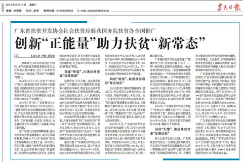 本网讯(通讯员 伍烨泉) 2015年2月16日,中央权威媒体——农民日报以 《创新‘正能量’ 助力扶贫‘新常态’》为题,深度提炼总结广东省扶贫开发协会开展社会扶贫工作的成效、经验与做法。报道一经刊出即引起各大媒体包括报刊、网络的广泛关注,中国农业新闻网、人民网、新华网、新民网、凤凰网等率先转发,累计转载量达到30000多条次,产生了积极而广泛的社会影响。