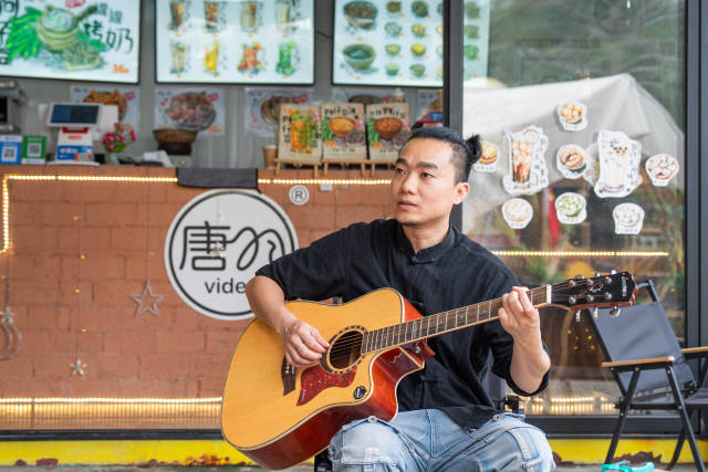 唐羽在创意园内弹吉他。