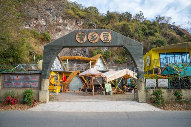阳江阳春市春湾镇,独特的喀斯特地貌峰林间,坐落着唐羽牌狗仔豆产业文化创意园,色彩鲜艳的集装箱,搭配“国潮”风设计,格外惹眼。