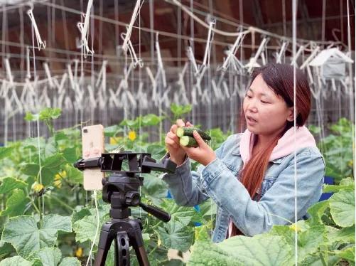 主播兰兰正在北京市密云区河南寨镇农户郝淑英家的大棚内直播。