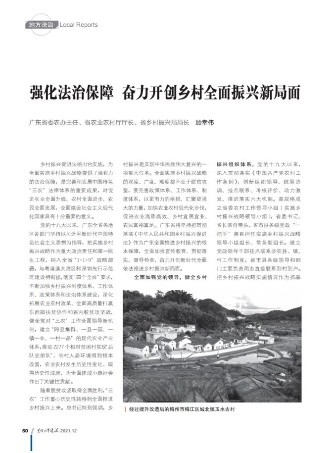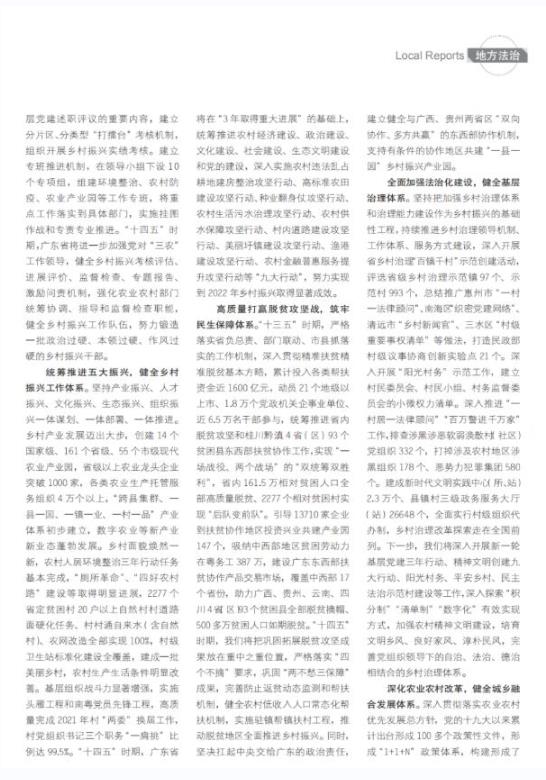 随着脱贫攻坚取得全面胜利,“三农”工作重心历史性转移到全面推进乡村振兴上来。总书记特别强调,乡村振兴是实现中华民族伟大复兴的一项重大任务。全面实施乡村振兴战略的深度、广度、难度都不亚于脱贫攻坚,要完善政策体系、工作体系、制度体系,以更有力的举措、汇聚更强大的力量,加快农业农村现代化步伐,促进农业高质高效、乡村宜居宜业、农民富裕富足。广东省将坚持把贯彻落实《中华人民共和国乡村振兴促进法》作为广东全面推进乡村振兴的根本保障,全面加强宣传教育、贯彻落实、督导检查,奋力开创新时代全面依法推进乡村振兴新局面。