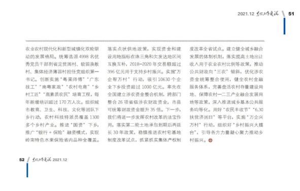 深化农业农村改革,健全城乡融合发展体系。深入贯彻落实农业农村优先发展总方针,党的十九大以来累计出台形成100多个政策性文件,形成“1+1+N”政策体系,构建形成了农业农村现代化和新型城镇化双轮驱动的发展格局。统筹选派4998名优秀党员干部到省定贫困村、软弱涣散村、集体经济薄弱村担任党组织第一书记。创新实施“粤菜师傅”“广东技工”“南粤家政”“农村电商”“乡村工匠”“高素质农民”培育工程,每年新增培训超过170万人次。组织城市教育、卫生、科技、文化等团队下乡行动,农村科技特派员覆盖1300多个乡村产业。推进“国资”下乡,推广“银行+ 保险”融资模式,实现岭南特色水果保险省内品种全覆盖。落实点状供地政策,实现资金和建设用地指标在珠三角和欠发达地区间互换互补,2018-2020年交易额超过396亿元用于支持乡村振兴。实施“万企帮万村”行动,吸引10630个企业下乡投资超过1000亿元。率先在全国建立涉农资金整合机制,跨部门整合26 项省级涉农财政资金,市县可统筹财政资金提升35倍。下一步, 我们将进一步发挥农村改革的法宝作用,落实第二轮土地承包到期后再延长30年政策,稳慎推进农村宅基地制度改革试点,抓紧抓实集体产权制度改革全省试点。建立健全城乡融合发展的体制机制,落实提高土地出让收入用于农业农村比例等政策,推动公共财政向“三农”倾斜,优化涉农资金统筹整合使用,健全农村金融服务体系,完善盘活农村存量建设用地、保障农村一二三产业融合发展用地等政策,深入推进城乡基本公共服务均等化。用好“农民丰收节”“6.30扶贫济困日”等平台,实施“万企兴万村”行动,组织好“乡村振兴大擂台”,引导各方力量凝心聚力推动乡村振兴。