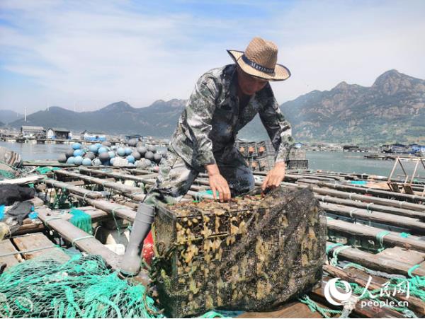 ▲养殖户黄安登在收获自家的鲍鱼。人民网记者 李栋摄
