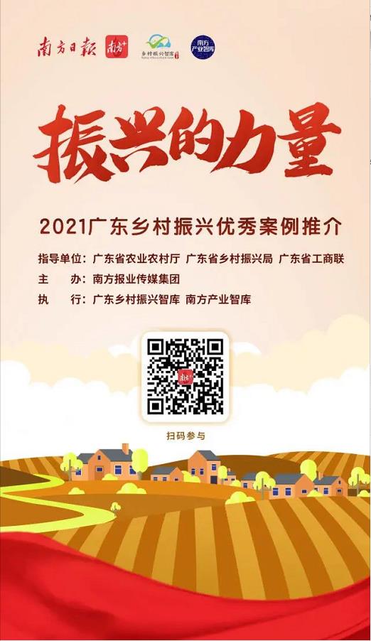 在广东省农业农村厅、省乡村振兴局与省工商联的指导下,南方报业传媒集团开展“振兴的力量——2021广东乡村振兴优秀案例推介活动”,发掘乡村振兴优秀案例,宣传推广好做法、好经验,助推广东乡村全面振兴。