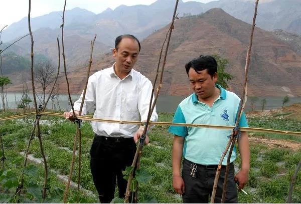 姜仕坤(左)在贵州晴隆县长流乡与村民交流(资料照片)。新华社发