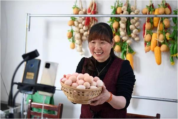 在安徽省六安市舒城县南港镇公义村钱元玲的家庭农场,钱元玲在直播间售卖土鸡蛋(2021年3月4日摄)。新华社记者黄博涵摄