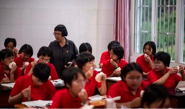 云南丽江华坪女子高级中学校长张桂梅在晨读之后来到教室督促大家好好吃饭(2021年8月24日摄)。新华社记者江文耀摄