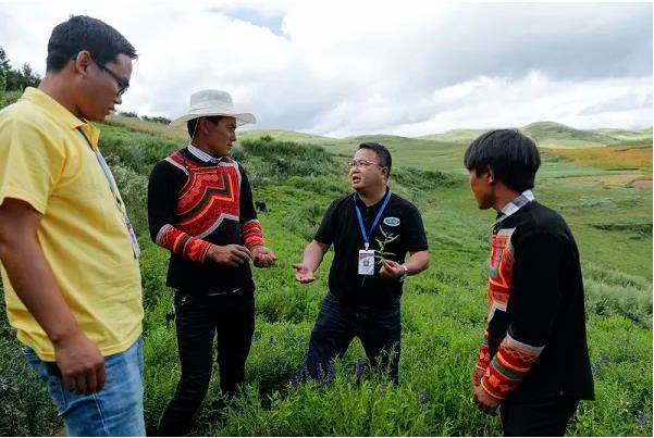 在位于四川省凉山彝族自治州昭觉县龙沟乡境内黄芩种植基地,西南医科大学副教授夏纪毅(右二)和该校派出的驻村工作队员俄且莫机(左一)为当地彝族群众讲授黄芩种植和采摘技术(2020年8月14日摄)。新华社记者沈伯韩摄