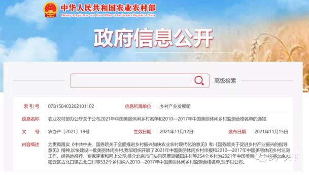 农业农村部办公厅关于公布2021年中国美丽休闲乡村名单和2010—2017年中国美丽休闲乡村监测合格名单的通知
