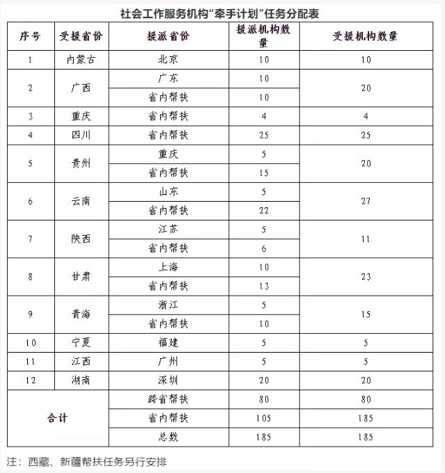 160个国家乡村振兴重点帮扶县为主,结合各地乡村振兴和乡镇(街道)社会工作服务站建设实际需要,确定一批受援机构,建立援派机构和受援机构一对一结对帮扶关系,实现国家乡村振兴重点帮扶县“牵手计划”全覆盖。鼓励结合援藏、援疆工作实际,选派社会工作服务机构对口帮扶西藏自治区和新疆维吾尔自治区社会工作服务机构。鼓励延续往年“牵手计划”实施任务,拓展受益范围,创新实施方式,结合各地乡村振兴和乡镇(街道)社会工作服务站建设实际需要,多方筹集财政资金、彩票公益金和社会资金等,开展结对帮扶工作。