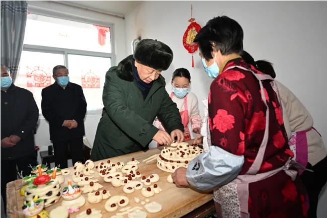 师红兵家4间窑洞去年因强降雨全部倒塌,在政府补助和各方援助下重建了2间装配式住房,目前全家已经入住。习近平仔细察看院落、住房。看到师红兵一家正在做年馍,习近平加入进来,捏了一个枣花,并为面团点上红枣。欢声笑语中,一个个年馍制作出来,格外喜庆。
