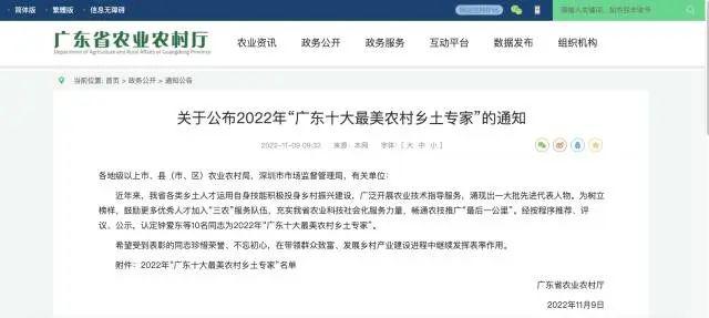 11月9日,省农业农村厅公布了2022年“广东十大最美农村乡土专家”名单,来自广州、韶关、河源、梅州、惠州、汕尾、阳江、湛江、清远、潮州的10位农村乡土专家名列其中。