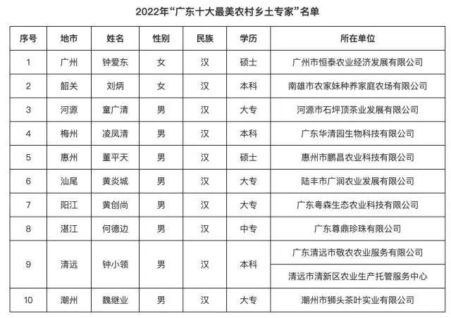 这10位“广东最美农村乡土专家”分别是:广州市恒泰农业经济发展有限公司的钟爱东,南雄市农家妹种养家庭农场有限公司的刘炳,河源市石坪顶茶业发展有限公司的童广清,广东华清园生物科技有限公司的凌凤清,惠州市鹏昌农业科技有限公司的董平天,陆丰市广润农业发展有限公司的黄炎城,广东粤森生态农业科技有限公司的黄创尚,广东尊鼎珍珠有限公司的何德边,广东清远市敬农农业服务有限公司、清远市清新区农业生产托管服务中心的钟小领,潮州市狮头茶叶实业有限公司的魏继业。