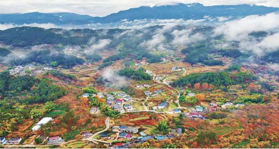 建设宜居宜业和美乡村是农业强国的应有之义。近年来,安徽省安庆市岳西县不断改善山区交通条件,切实推进村容村貌和人居环境整治。图为2022年11月22日,在岳西县天堂镇城南社区,错落有致的民居、通村入户的公路、红绿相间的植被在云雾笼罩下美若画卷。人民图片 吴均奇/摄