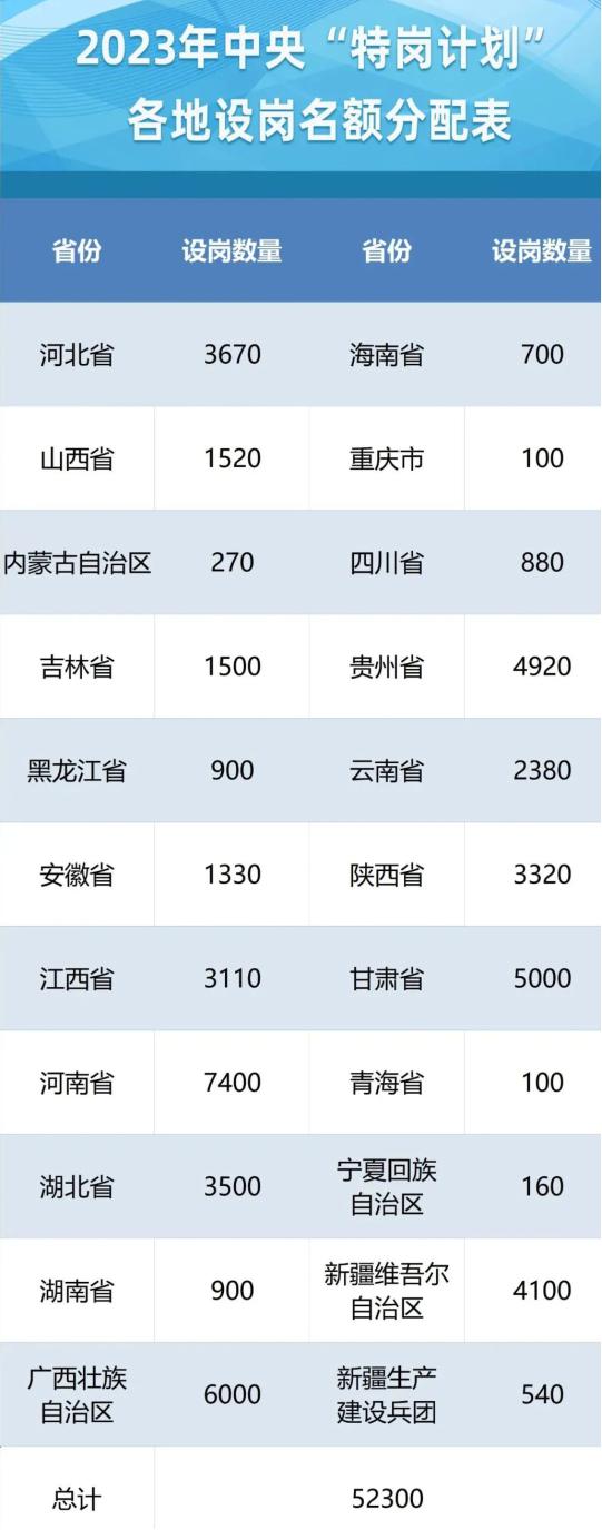近日,教育部、财政部联合印发《关于做好2023年农村义务教育阶段学校教师特设岗位计划实施工作的通知》,全国计划招聘特岗教师52300名。