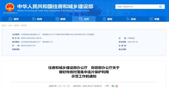 住房和城乡建设部、财政部4月27日发布《关于做好传统村落集中连片保护利用示范工作的通知》,要求各示范县抓紧完善并印发传统村落集中连片保护利用示范工作方案,并在工作方案基础上编制并印发县域传统村落集中连片保护利用规划。