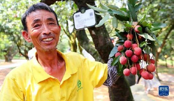 6月12日,在广东茂名高州市根子镇柏桥村荔枝种植园,一位果农展示从树龄约1300年的“天伦之乐”古树上采摘的荔枝。新华社记者 龚兵 摄