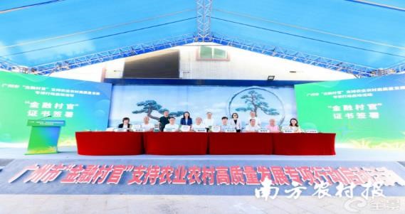 活动现场,在广州市地方金融监管局、市农业农村局和花都区政府的共同见证下,工商银行、农业银行、中国银行、建设银行、浙商银行、花都稠州村镇银行等6家银行机构与花都区花山镇花城村、五星村、花东镇港头村、赤坭镇瑞岭村、莲塘村、炭步镇塱头村、狮岭镇马岭村、梯面镇红山村、联民村、民安村,以及广州金服等共同签署了“金融村官”证书,并由花都区金融局、花都区农业农村局、广州金服负责同志为广州市首批“金融村官”颁发证书。