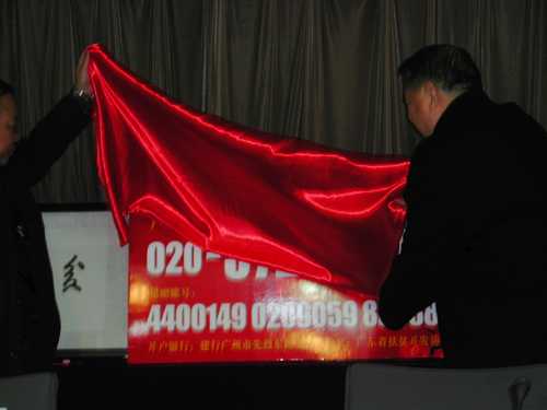 协会荣誉主席宋司令、省扶贫办副主任魏联辉、协会副理事长黄国柱共同为广东扶贫捐赠热线与捐赠账号揭幕