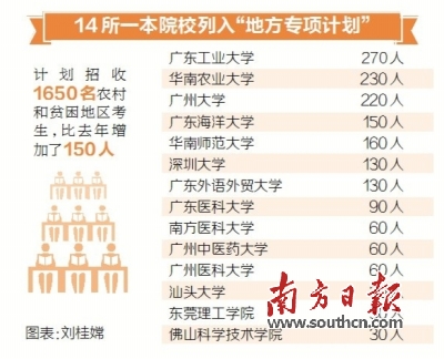 据统计,广东14所第一批本科院校列入“地方专项计划”,计划招收1650名农村和贫困地区考生,比去年增加了150人。