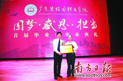 在当天的毕业典礼上,梁健代表广东省扶贫办向碧桂园职院授予“广东省扶贫致富带头人培训基地”牌匾。中国职业教育学会副会长、广东省职业教育学会会长李小鲁表示,杨国强以自己的善举、善行举起了道义的大旗,创办了碧桂园职院,对全国奋斗当中的人们是一个示范,是一个引领,是一个义举;同时,以自己强大的企业为依托,将产教融合、校企合作落到了实处,从而开创了中国职业教育产教融合的先河,这是一个创举;而从源头上来帮助贫困家庭通过学习,输出一批人,阻断一个家庭贫困命运的代际传递,这是扶贫工作的一种壮举。