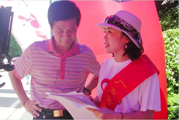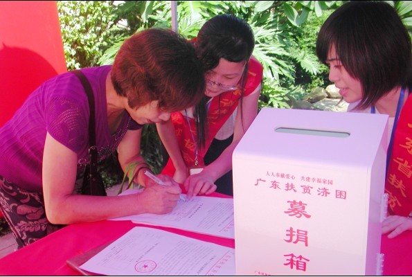 “扶贫济困——我参与,我奉献,我快乐!”为表示对扶贫活动的支持,还有扶贫志愿者将家人和男朋友也动员到活动现场,了解广东扶贫济困活动,并表达爱心捐赠。