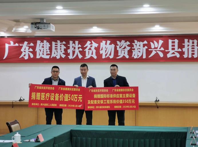 1月14日,广东健康扶贫物资捐赠仪式在新兴举行。由广东省扶贫开发协会副理事长、广东省健康扶贫委员会副主任委员、广州市威科医疗设备工程有限公司董事长胡国威捐赠的价值400万元医疗物资被交到了新兴县妇幼保健院、新兴县第二人民医院负责人手上。其中包括价值350万元的国际标准供应室主要设备及配套安装工程系统和价值50万元的医疗设备。这也是继2019年12月之后,广东健康扶贫活动再度走进云浮。此前,广州市威科医疗设备工程有限公司已向云浮市基层医疗卫生单位捐赠了价值500万元医疗器械。