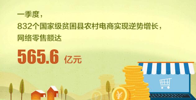 据商务部消息,根据第三方数据,今年一季度,832个国家级贫困县农村电商实现逆势增长,网络零售额达565.6亿元,同比增长5.0%,高出全国农村平均增速1.9个百分点。