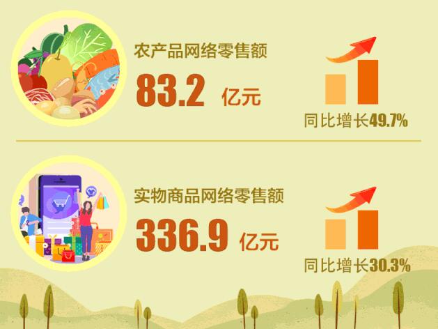 其中,农产品网络零售额83.2亿元,同比增长49.7%,高出全国农村平均增速11.5个百分点。