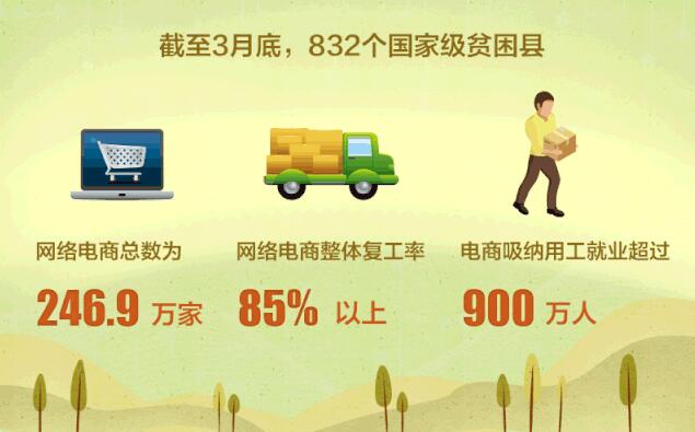 农村电商创新创业势头不减。截至3月底,832个国家级贫困县网络电商总数为246.9万家,同比增长7.0%。国家级贫困县网络电商整体复工率达85%以上。据估算,国家级贫困县电商吸纳用工就业超过900万人。