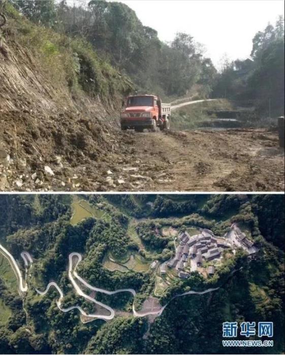 ▲拼版照片:上图为脱贫前的湖南省花垣县十八洞村进村道路(2011年12月摄新华社发);下图为2019年9月拍摄的湖南省花垣县十八洞村及进村道路(新华社记者陈泽国摄,无人机照片)。新华社发