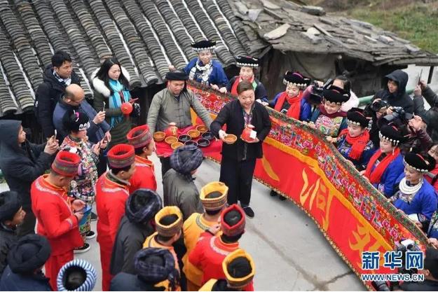 ▲在湖南省花垣县十八洞村,新郎的迎亲队伍遇上新娘亲友“拦门”(2018年2月4日摄)。新华社记者 薛宇舸 摄
