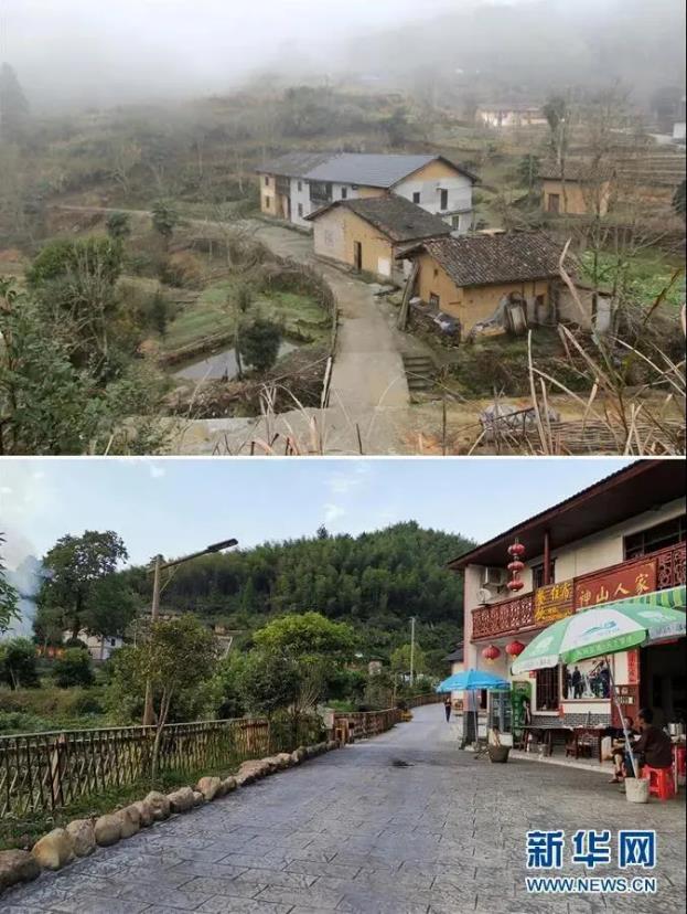 ▲拼版照片:上图为脱贫前的江西井冈山神山村一角(2016年1月摄);下图为2019年9月拍摄的江西井冈山神山村一角。新华社发