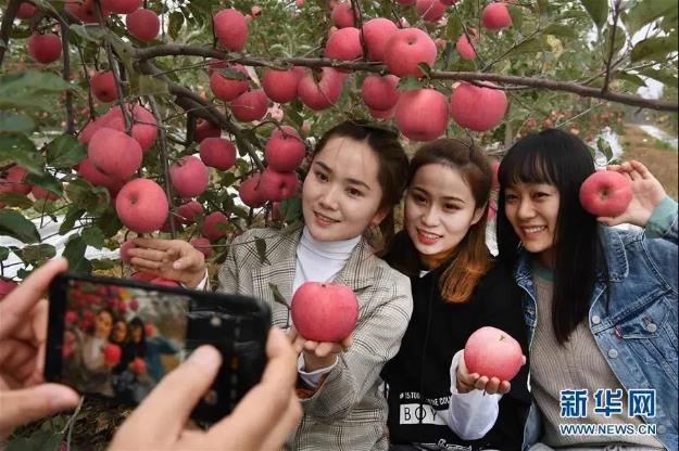▲游客在陕西省延安市志丹县双河镇李家湾村果园拍照留影(2019年10月22日摄)。新华社记者 陶明 摄