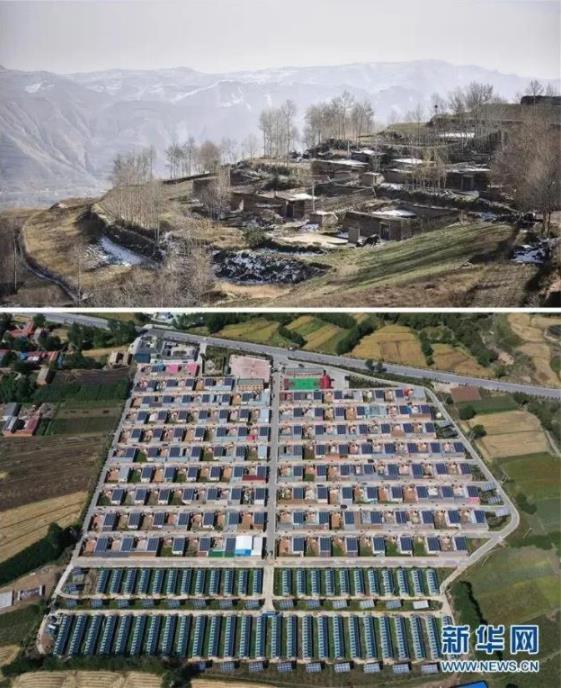 ▲拼版照片:上图为2016年11月拍摄的脱贫前的青海互助土族自治县班彦村村貌(新华社记者吴刚摄,无人机照片);下图为2019年9月拍摄的青海互助土族自治县班彦新村村貌(新华社记者张宏祥摄,无人机照片)。新华社发