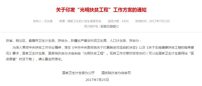 今年是脱贫攻坚的决胜之年,脱贫攻坚中健康扶贫包括白内障等眼科疾病有关内容。今日上午,国家卫生健康委员会新闻发布会上,中国扶贫志愿服务促进会副会长李守山介绍了“光明扶贫工程”相关情况。