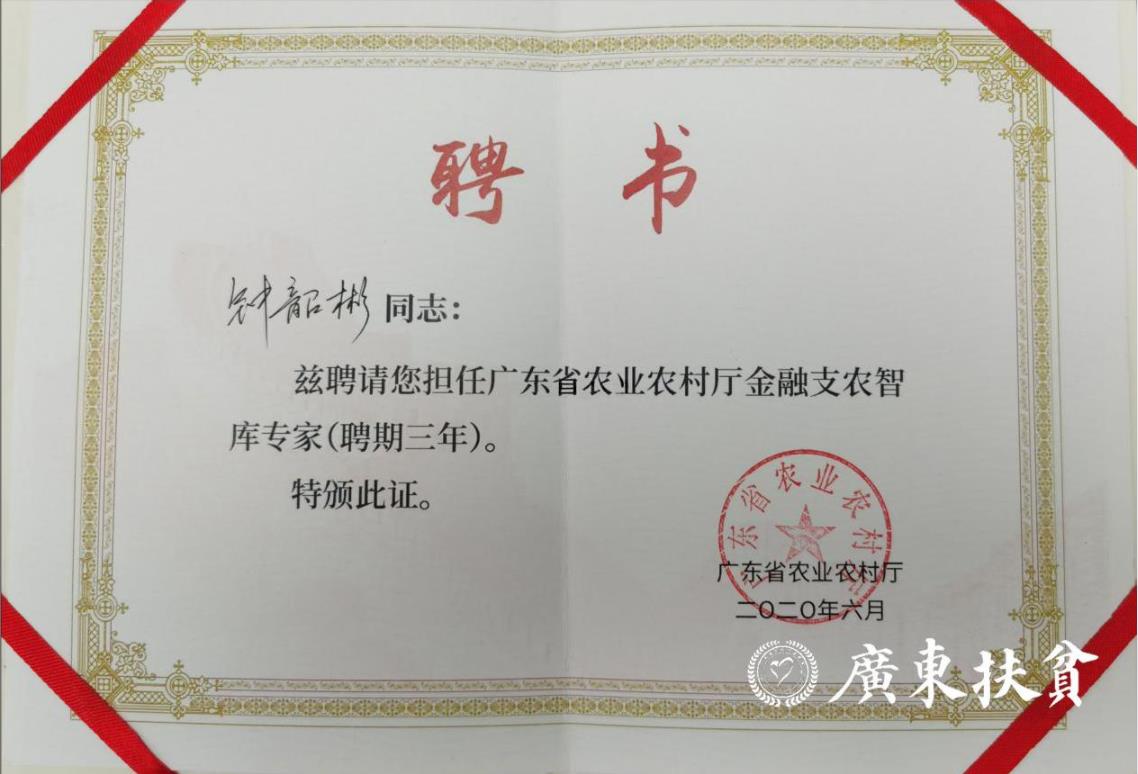 广东扶贫新媒体中心处讯(通讯员/陈妃明) 6月8日,广东省农业农村厅举行全省农业保险信息化试点发布暨金融支农智库成立大会,现场启动广东农业保险信息化试点,成立省农业农村厅金融支农智库,广东省人民政府参事室特约研究员、广东省扶贫开发协会常务副理事长兼秘书长、广东省南方扶贫开发研究院院长钟韶彬获聘首届广东金融支农智库专家。