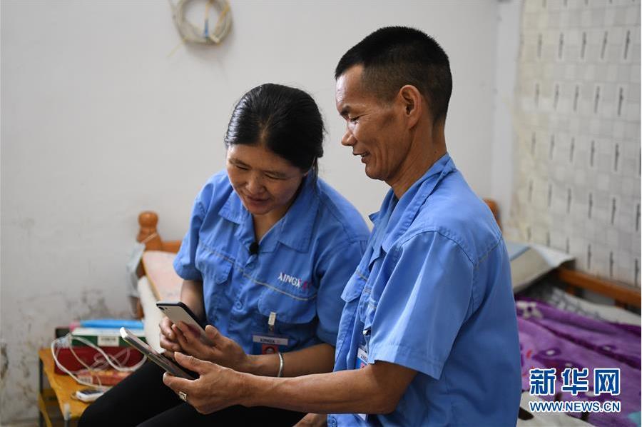 ▲在佛山市三水区广东星星制冷设备有限公司提供的夫妻宿舍里,李力挖(右)、何公各在休息时间玩手机(6月22日摄)。新华社记者邓华摄。