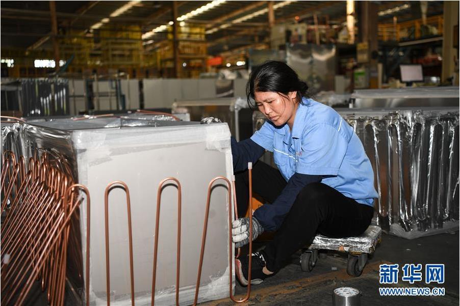 ▲在佛山市三水区广东星星制冷设备有限公司车间内,来自四川凉山彝族自治州盐源县的李力挖在流水线上组装作业(6月22日摄)。新华社记者邓华摄。