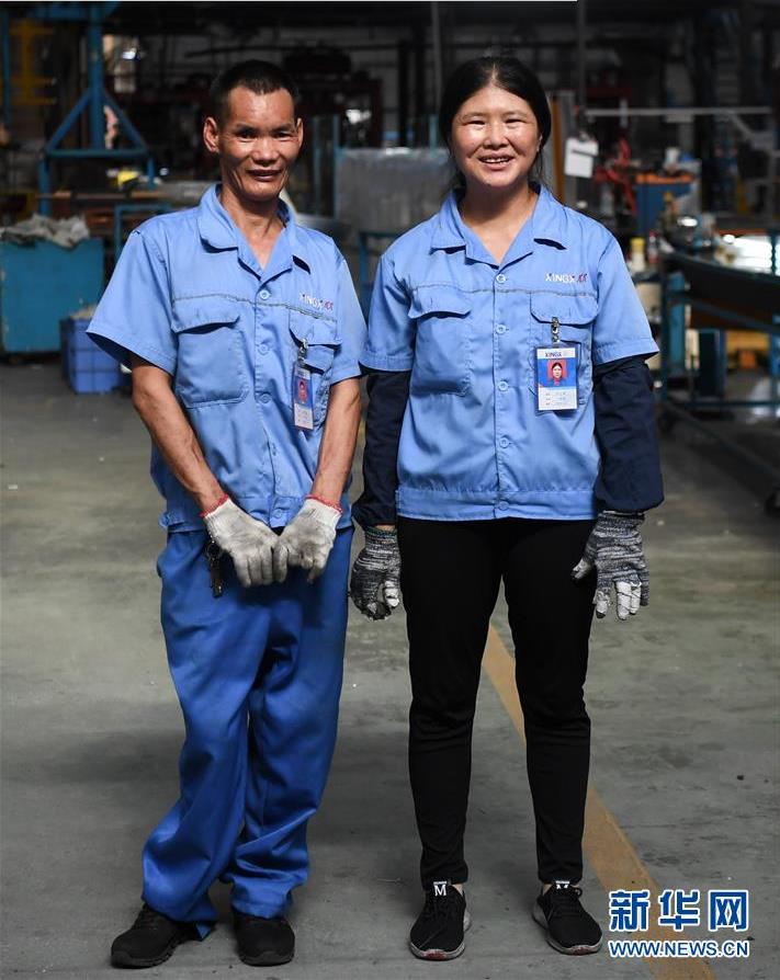 盛夏,佛山市三水区广东星星制冷设备有限公司的车间内,45岁的李力挖正在流水线上给制冷橱柜安装压缩机。虽然个子不高且身患残疾,但他动作熟练,是车间里公认干活最卖力的员工之一。在这个大车间的另一边,李力挖的妻子、48岁的何公各负责组装制冷橱柜,她很爱笑,眼睛常常眯成月牙形。
