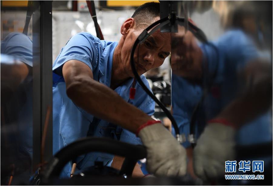 ▲在佛山市三水区广东星星制冷设备有限公司车间内,来自四川凉山彝族自治州盐源县的何公各在组装设备(6月22日摄)。新华社记者邓华摄。