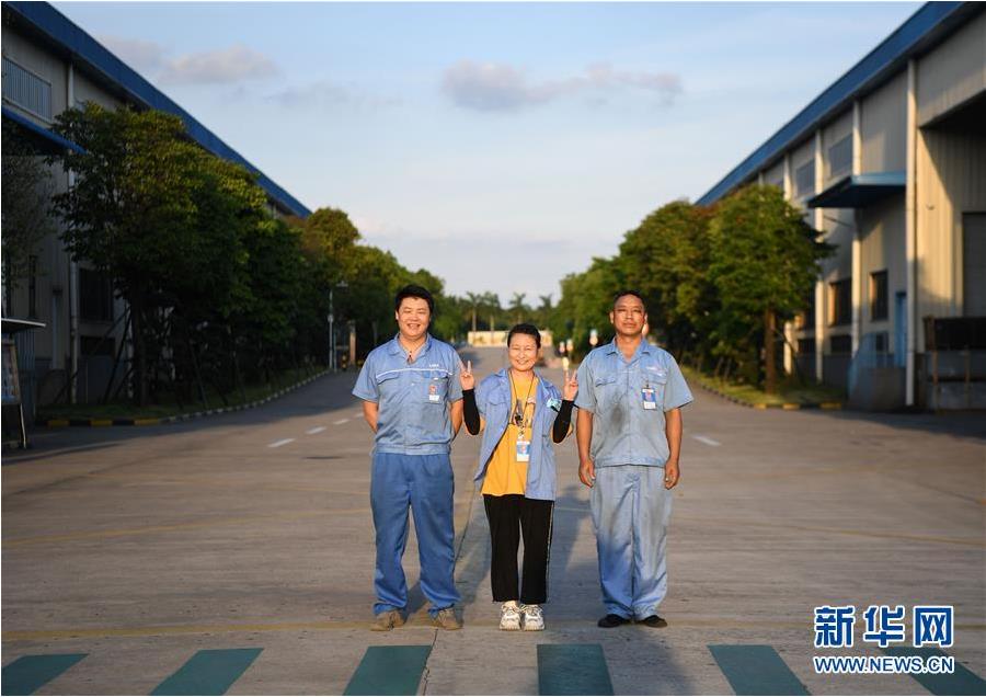 ▲在佛山市三水区广东星星制冷设备有限公司,来自四川凉山彝族自治州盐源县的贫困务工人员伍元国、易争咪、董正军(从左至右)下班后在厂区合影,他们通过东西部扶贫协作在这里实现就业(6月22日摄)。新华社记者邓华摄。