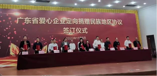 2020年11月5日,广东爱心企业定向捐赠民族地区协议签订仪式在清远市举行,省政府副秘书长杨鹏飞出席捐赠仪式并向爱心企业授牌,省民族宗教委党组书记、主任李秀英作讲话,省委农办、省扶贫办专职副主任梁健主持仪式。碧桂园控股有限公司、恒大集团、万科企业股份有限公司、广东长隆集团有限公司、星河湾集团有限公司、敏捷集团、广东珠江投资股份有限公司、腾讯公益慈善基金会等爱心企业、社会组织代表和民族地区3个自治县7个民族乡代表参加捐赠仪式并现场签订定向捐赠协议。省民族宗教委、省扶贫办、省扶贫基金会、省慈善总会、省扶贫开发协会以及韶关、清远市委市政府等有关负责同志出席仪式。