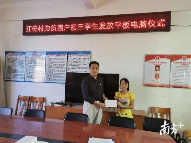 ▲阳山县青莲镇江佐村为贫困户初三学生发放平板电脑