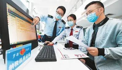 ▲在福建省福州市罗源县税务局办税大厅,税务人员帮助涉农企业工作人员查询纳税信用等级等信息。