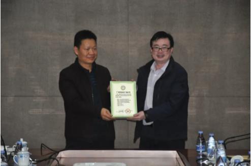 ▲广东省中药研究所所长曾庆钱向阳山县三连阳生态农林开发有限公司研制的中草药枕头颁发广东扶贫农产品证书